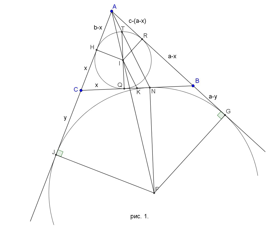 к АBC (см. рис. 1) тогда IT||FN, значит ∠AIT=∠AFN, IT/FN=IH/FJ=AI/AF, т.е. треугольники AIT и AFN подобны, а значит ∠IAT=∠FAN, т.е. точки A, T, N лежат на одной прямой.