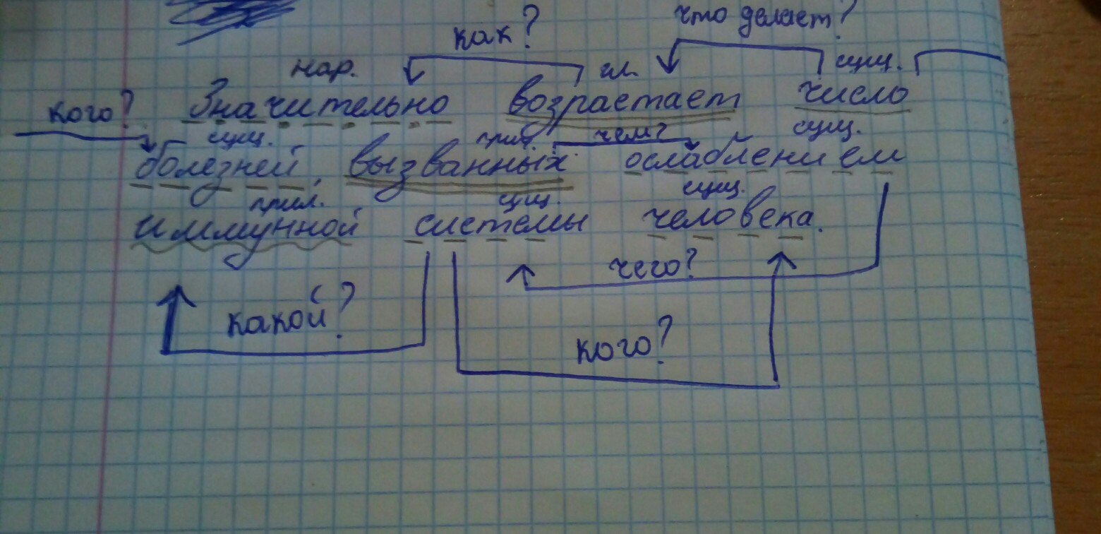 Значительно возрастает число болезней, вызванных ослаблением иммунной системы человека. Полный синтаксический разбор предложения ! Хелп!