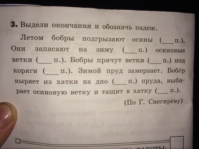 Летом бобрЫ подгрызаЮТ осинЫ( вин.). ОниИ запасаЮТ на зимУ( вин) осиновЫЕ веткИ( вин.). БобрЫ прячУТ веткИ ( вин.) под корягИ( вин.) Зимой пруд[] замерзаЕТ. Бобер[] ныряЕТ из хаткИ ( р.) на днО прудА, выбираЕТ осиновУЮ веткУ и тянЕТ в хаткУ( В.).