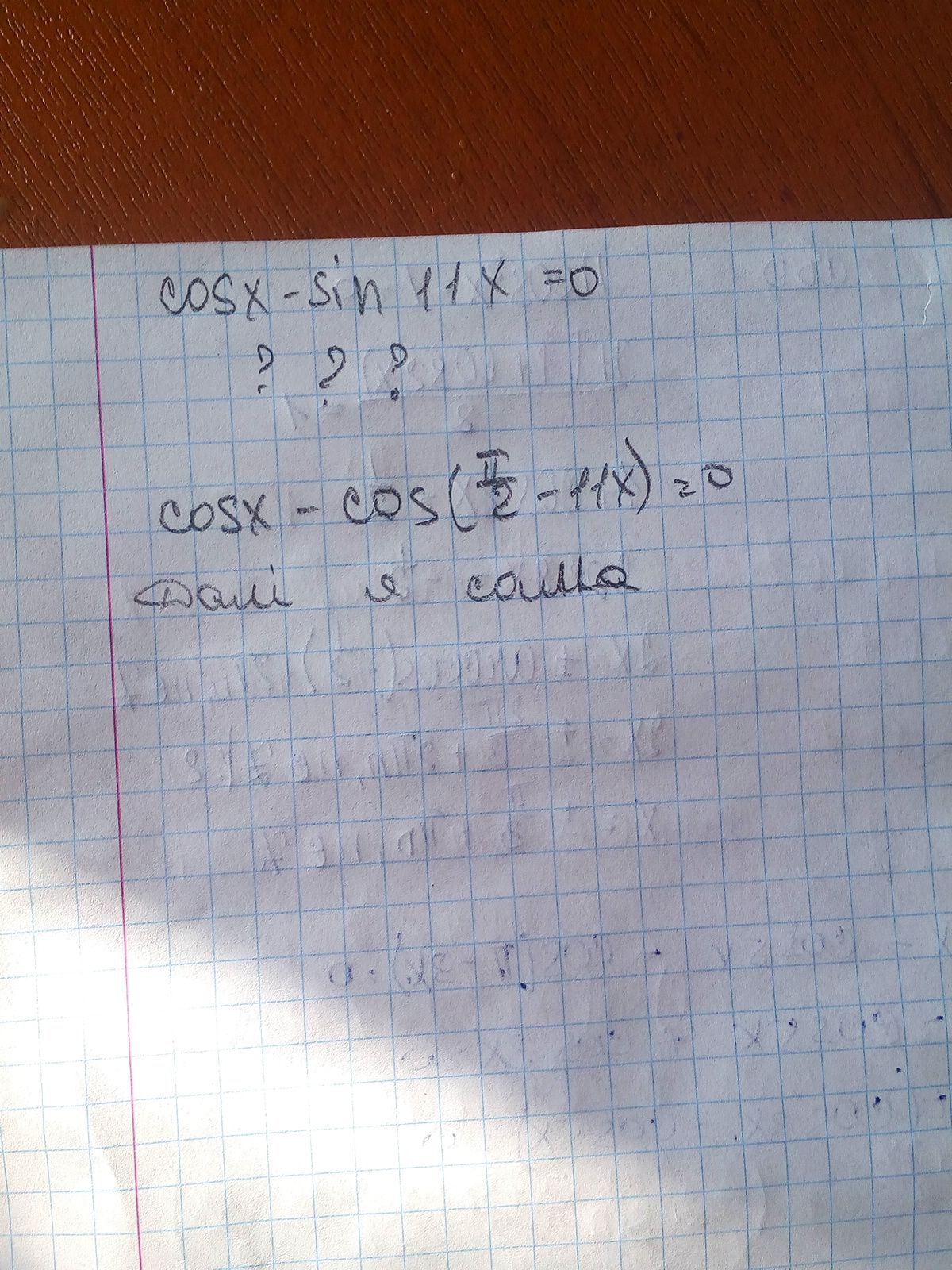 розпишіть кожний крок,кожен рядок,як від Cosx+sin(-11x)=0 до cosx-cos(π/2-11x)=0