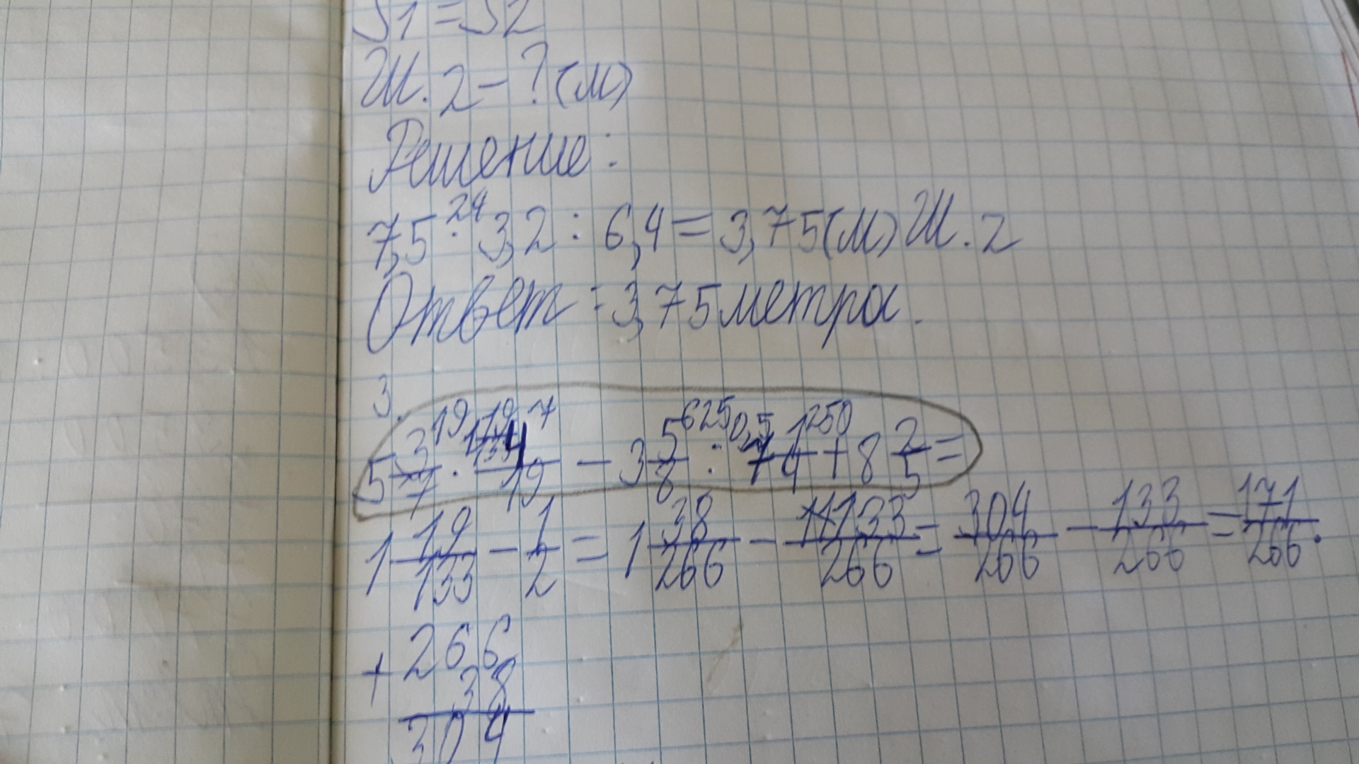 5³/₇ · ⁴/₁₉ - 3⁵/₈ : 7¹/₄ + 8²/₅= ³⁸/₇ · ⁴/₁₉ - ²⁹/₈ · ⁴/₂₉ + 8²/₅= ( сократить дроби)=