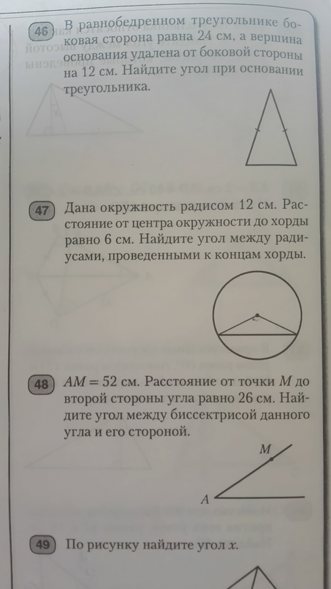 Пусть α-прилегающие к хорде углы, они равны, т к обе боковые стороны Δ = R, sin α=6/12=1/2, α=30°,