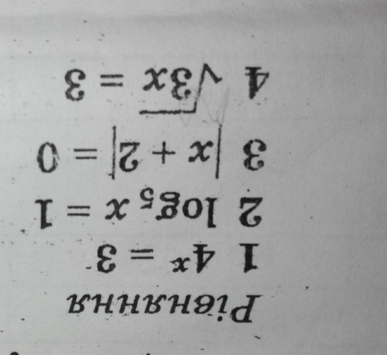 1)4^x=3 \ 4^x=4^{log_43} \ x=log_43 \ 2)log_5x=1 \ x=5^1 \ x=5 \ 3)|x+2|=0 \ x+2=0 \ x=-2 \ 4) sqrt{3x} =3 \ ( sqrt{3x} )^2=3^2 \ 3x=9 \ x=3