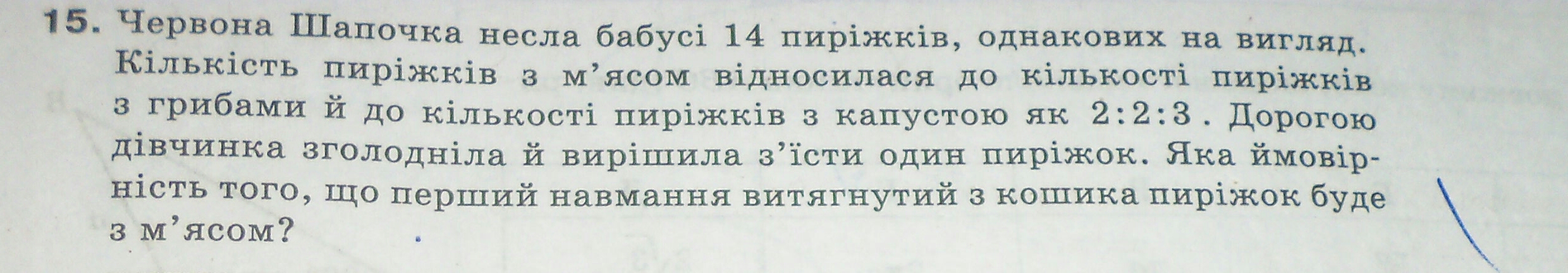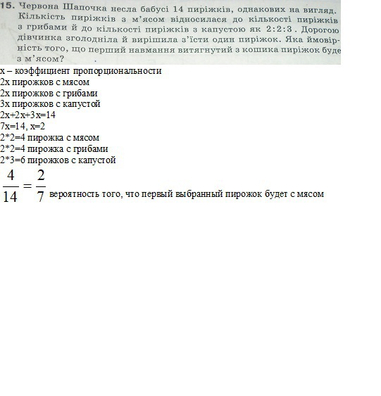 Чтобы получить вероятность попадания пирожка с мясом делим количество пирожков с мясом на общее количество пирожков. Получаем 4/14 = 2/7