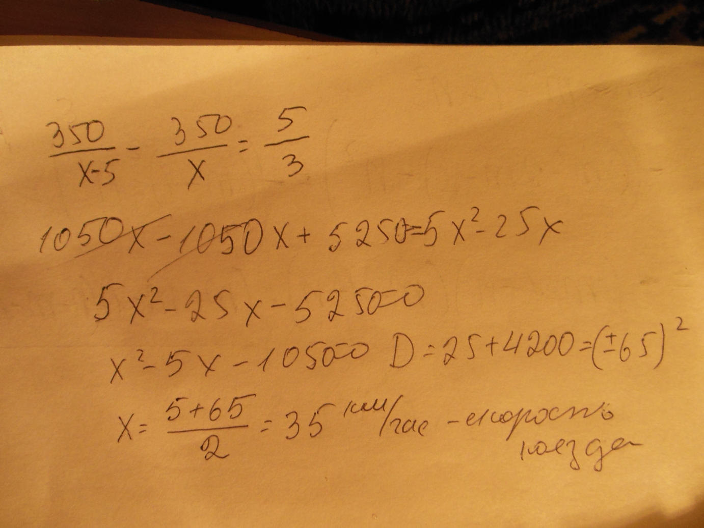 х-5км/ч если бы шел с такой скоростью,время 350/(х-5)