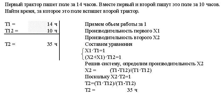 Какую формулу из физики можно применять для решения задач типа: Один трактор пашет поле за 14 часов, а два вместе такое же поле за 10, За какое время вспашет это поле один второй?