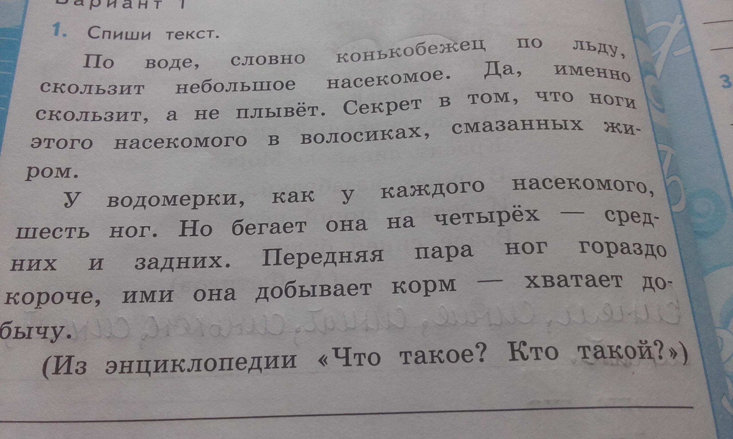1 Выпиши из текста слова, имеющие два корня. Выдели корни в словах. 2 Выпиши из текста пару однокоренных слов. 3 Подчеркни в тексте предложение, которое поясняет, почему насекомые легко скользит по поверхности воды.