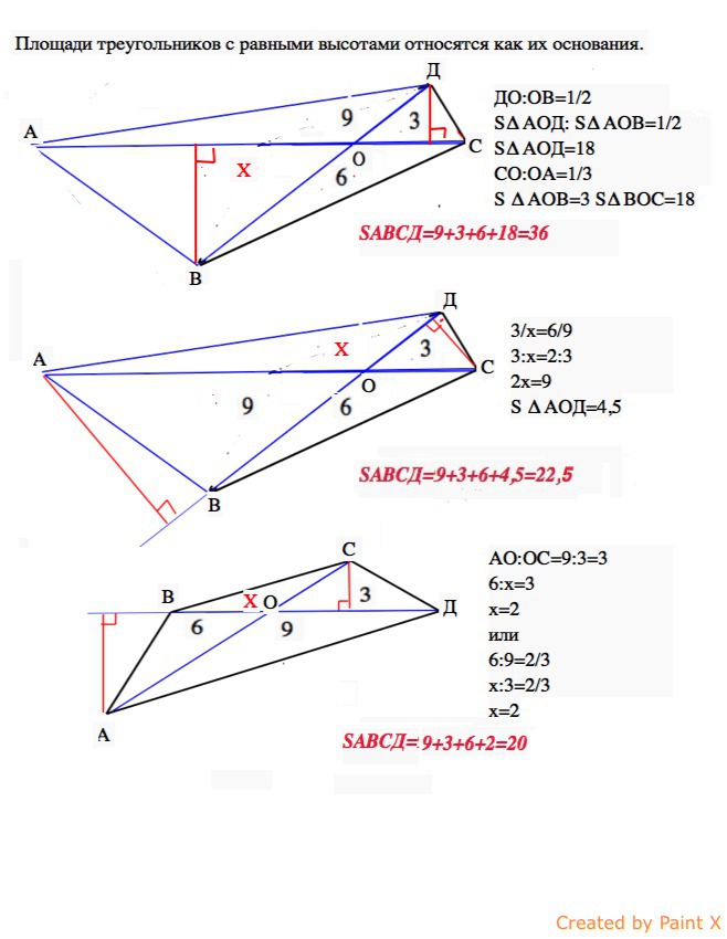 Диагонали выпуклого четырехугольника делят его на 4 треугольника. Площади трех из них равны 3, 6, 9. Найдите площадь четырехугольника