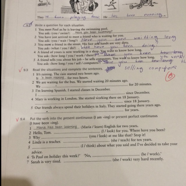 9.3 we have been waiting for the bus; have been learning Spanish; mary has been working in London; our friends have been spending their holidays in Italy.
