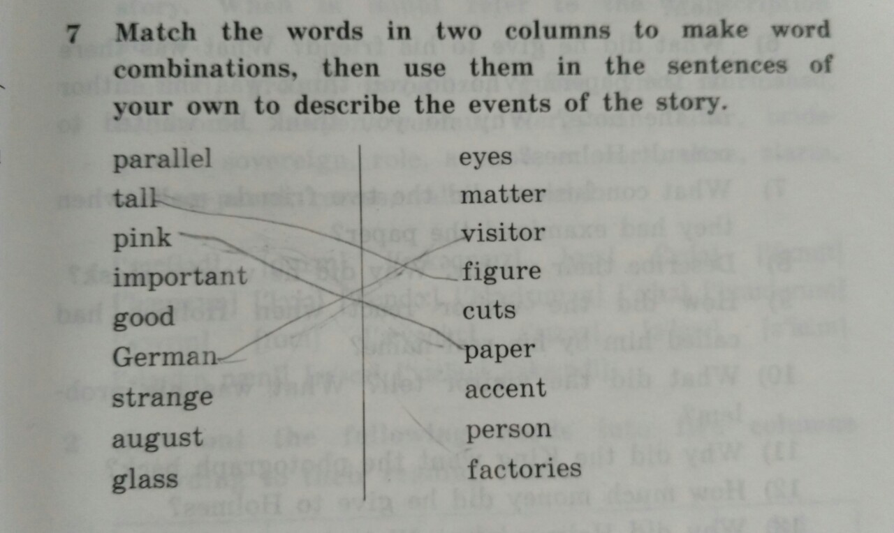 Я не смогла составить про завод и август, а так German accent, important visitor, tall person, strange matter, parallel cuts, pink paper, good eyes, glass figure. Перевод: Германский акцент, Важный посетитель, высокий человек, странный(ое) вопрос (дело), параллельный порез, розовая бумага, хорошие глаза, стеклянная фигурка