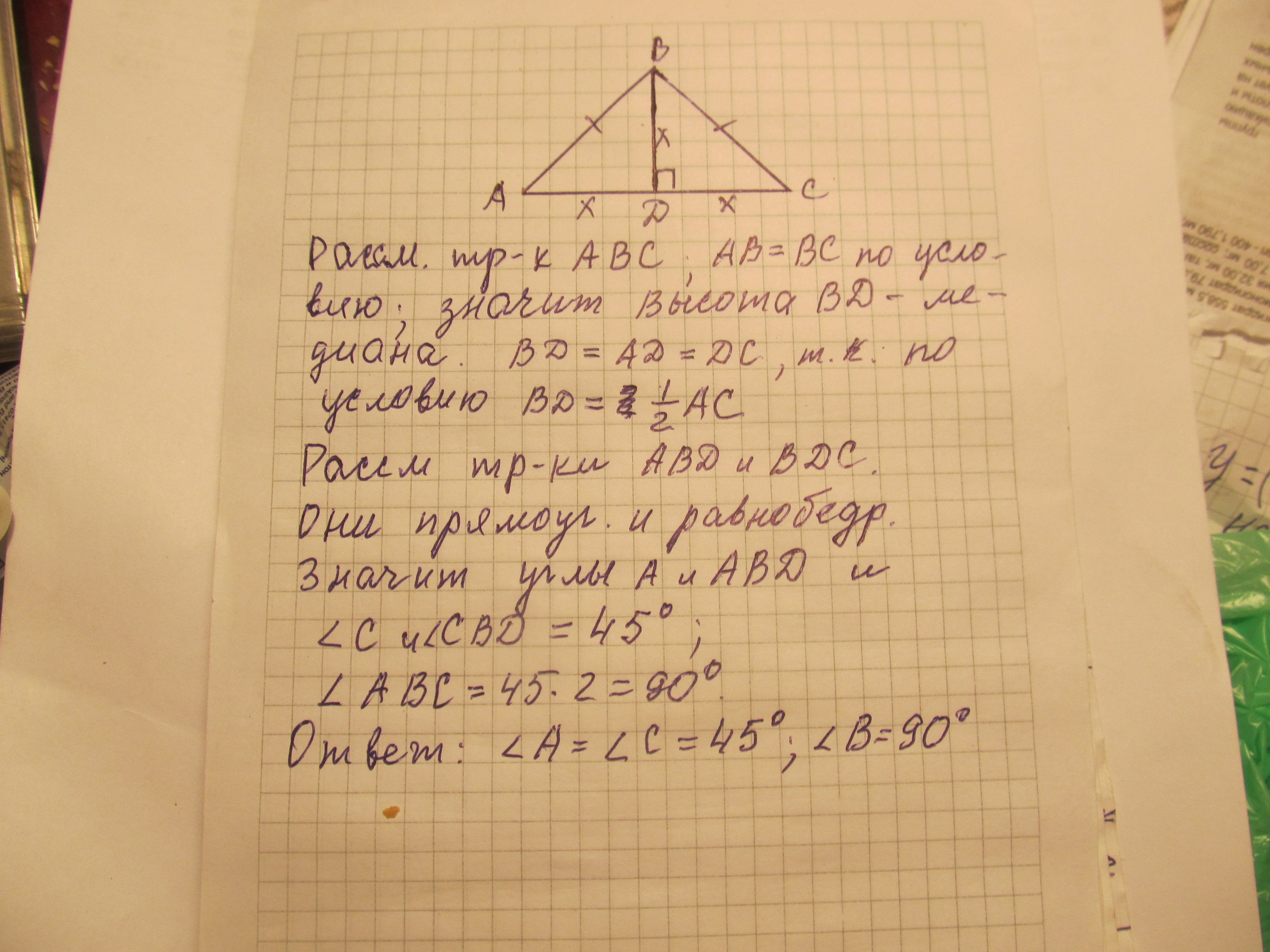 Высота равнобедренного треугольника, проведена к основанию,в 2 раза меньше этого основания. Найдите углы данного треугольника.