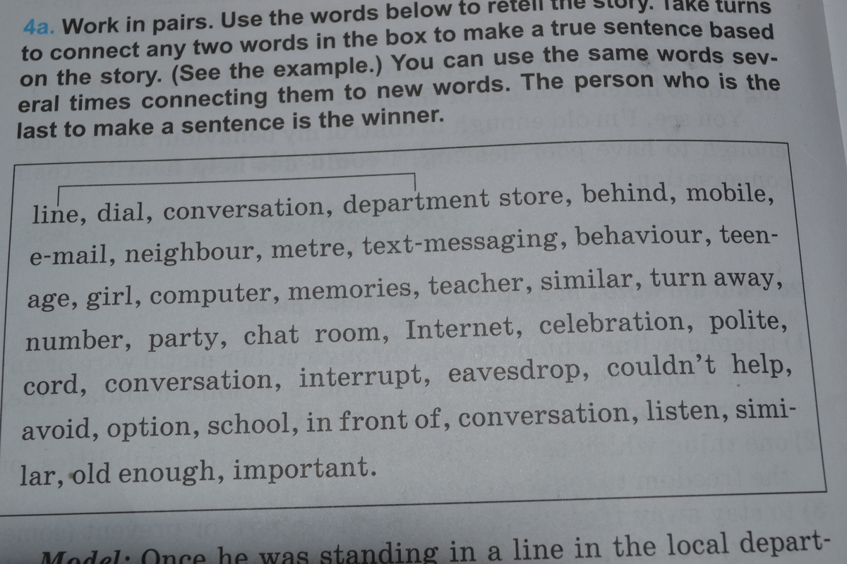 line, dial, conversation, department store, behind, mobile, e-mail, neighbour, metre, text-messaging, behaviour, teenage, girl, computer, memories, teacher, similar, turn away, number, вечеринка(party) , chat room, Internet, celebration, polite, cord , conversation, interrupt, eavesdrop, couldn’t help, avoid, option, school, in front of, conversation, listen, similar, old enough, important.