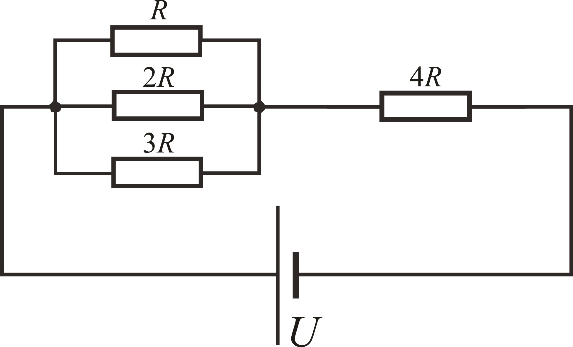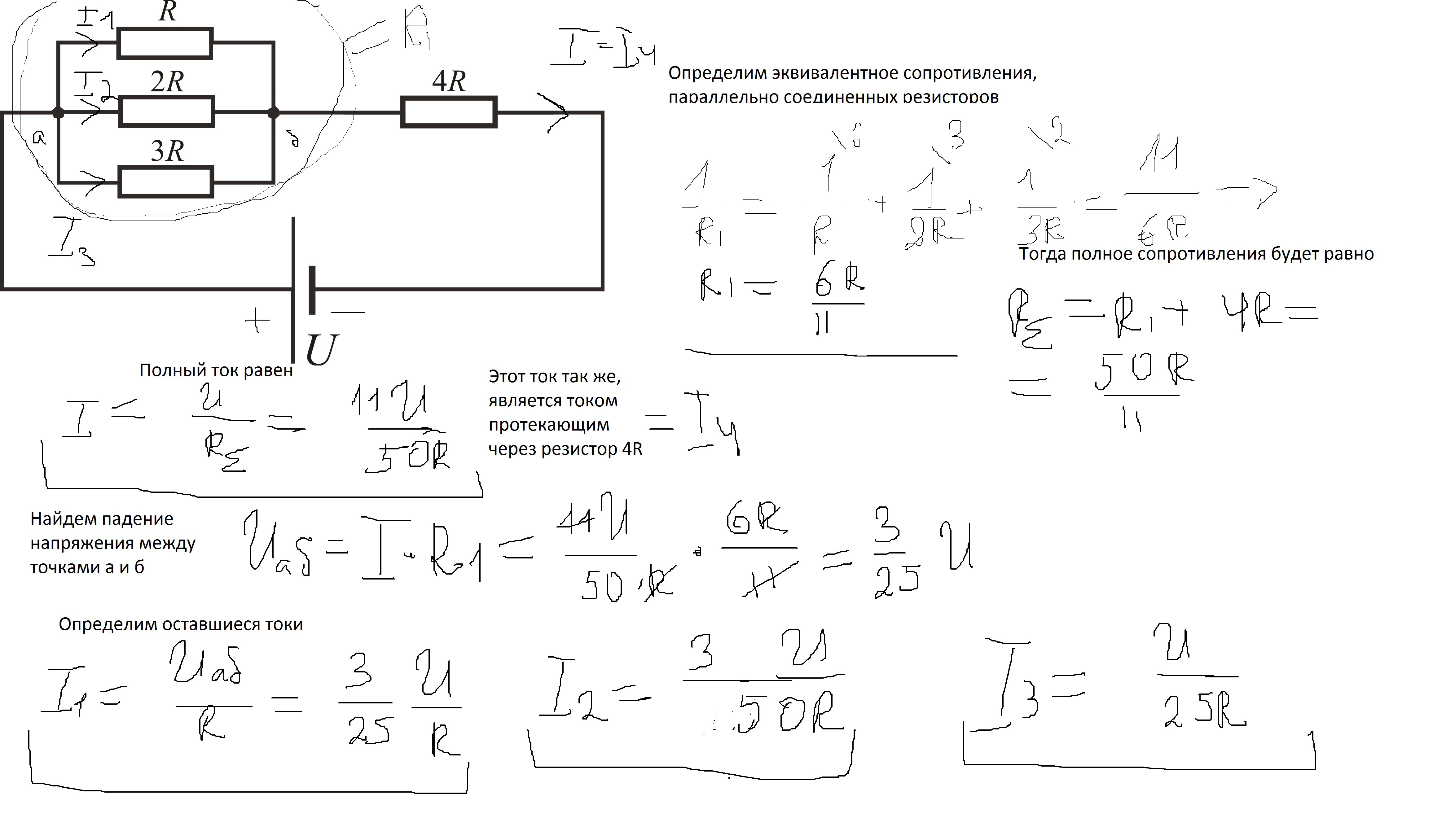 Определить токи через все резисторы в цепи, схема которой изображена на рисунке. Напряжение, на источнике U. Сопротивления резисторов указаны на схеме.