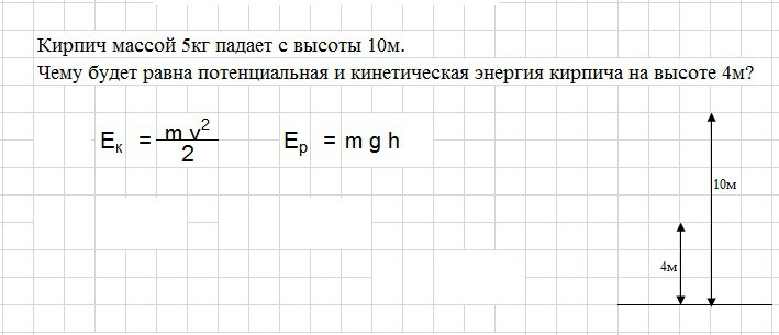Чему будет равна потенциальная и кинетическая энергия кирпича на высоте 4м?
