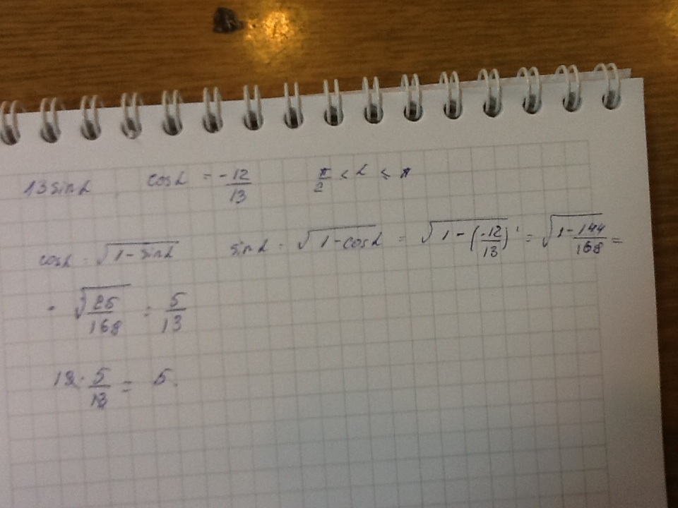 Найдите 13sinα, если cos α = -12/13 и π/2< α< π.
