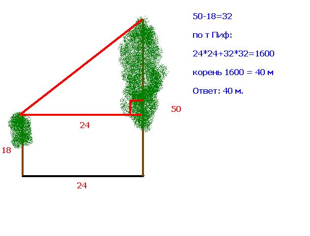 в 24 м одна от другой растут две сосны. высота одной сосны 50 м а другой 18 м. найдите расстояние между их верхушками