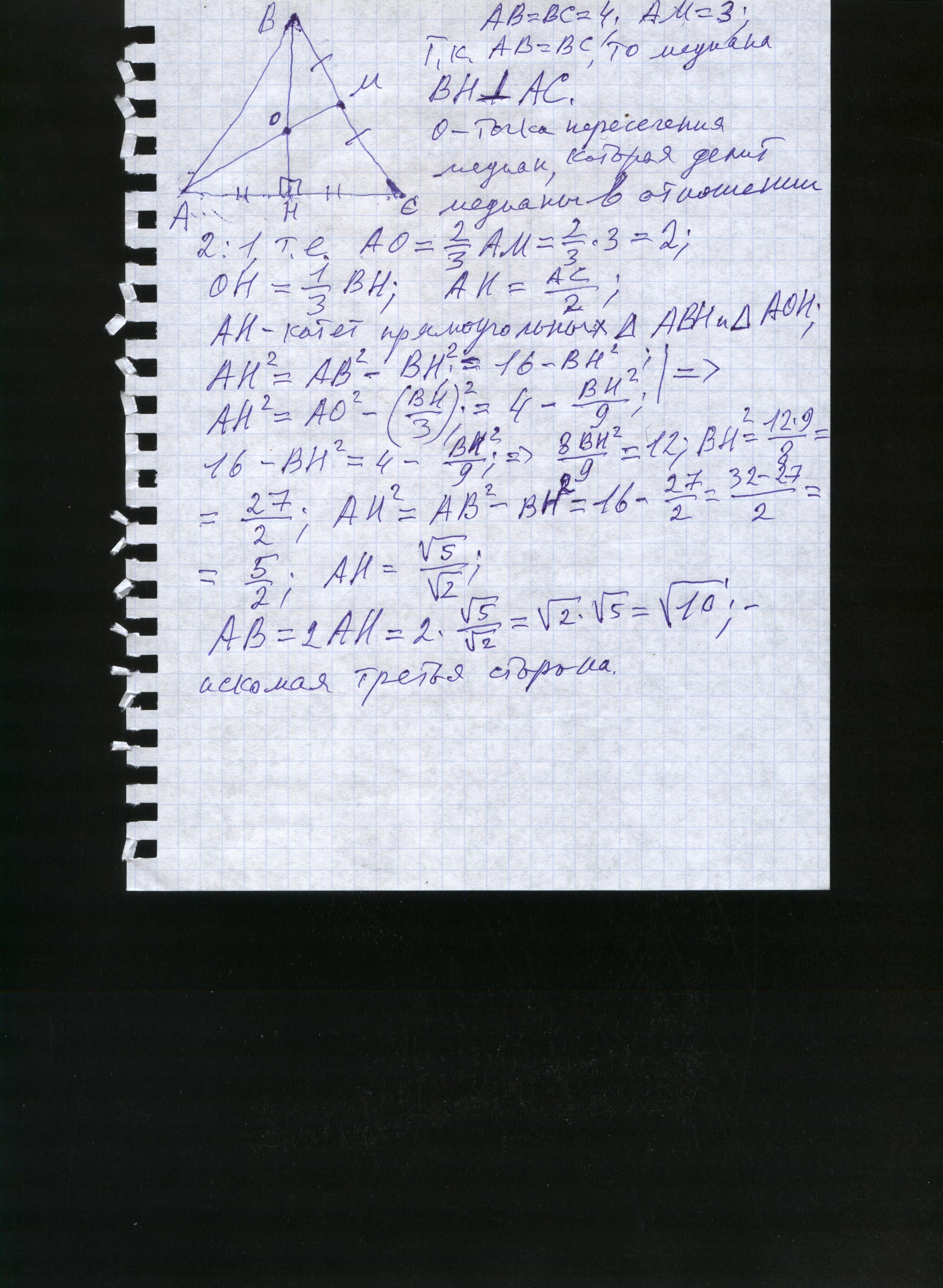 Дан тр-к АВС. АВ=ВС=4. АМ=3-медиана к стороне(не к основанию!!!) Найти стороны АВС. Помогите, очень срочно!!!
