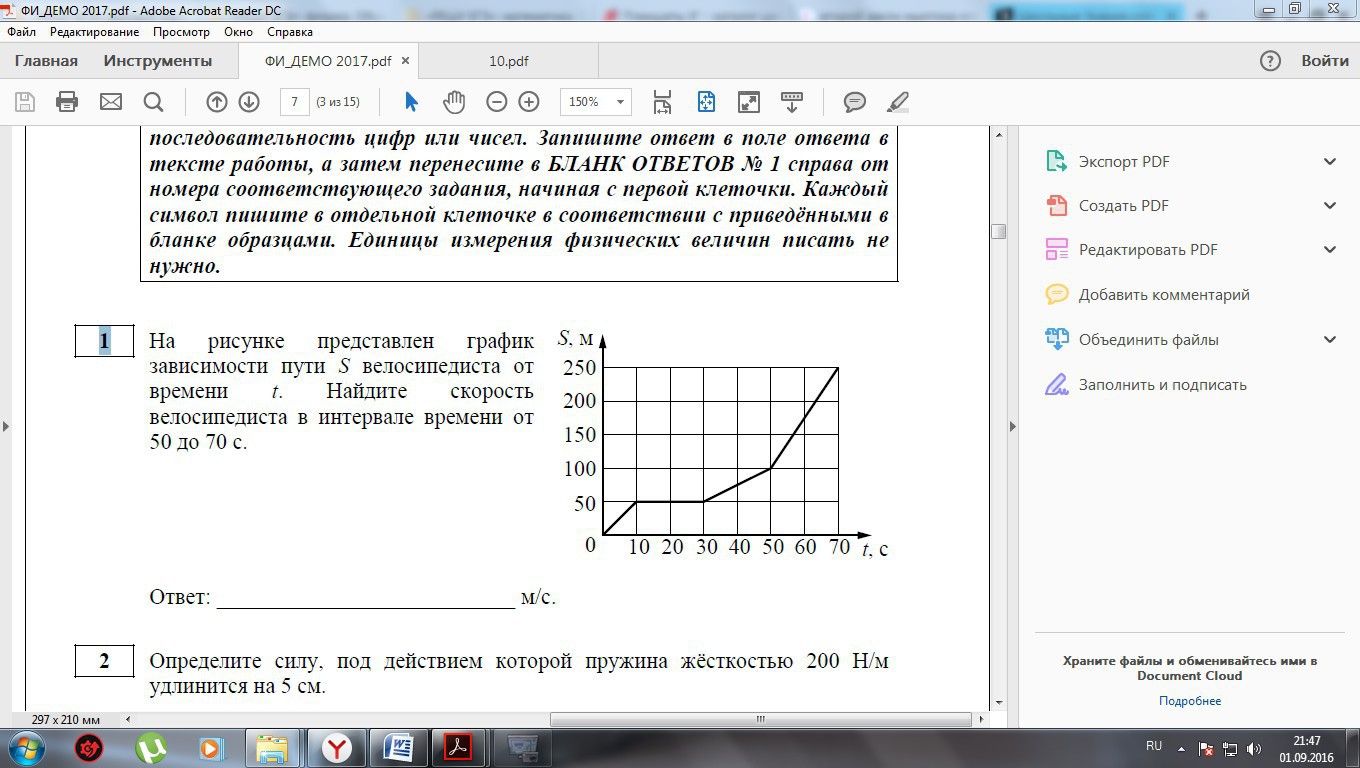 На рисунке представлен график зависимости пути S велосипедиста от времени t. Найдите скорость велосипедиста в интервале времени от 50 до 70 с.