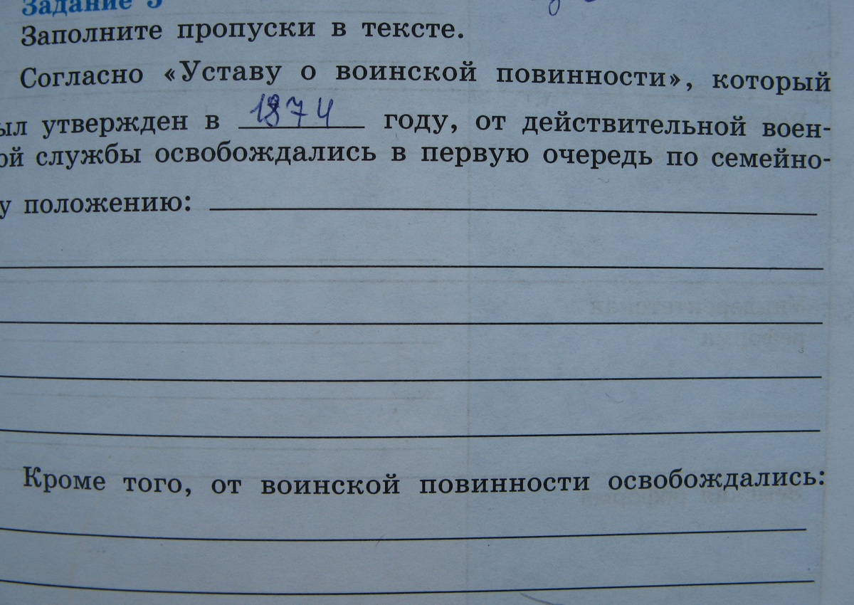 Согласно"Уставу о воинской повинности",который был утвержден в 1874 году,от действительной военной службы освобождались в первую очередь по семейному положению:Мужчины у которых был маленький ребенок(до 3х лет),если у мужчины есть болеющий родственник и юношам которые были младше 21 года.