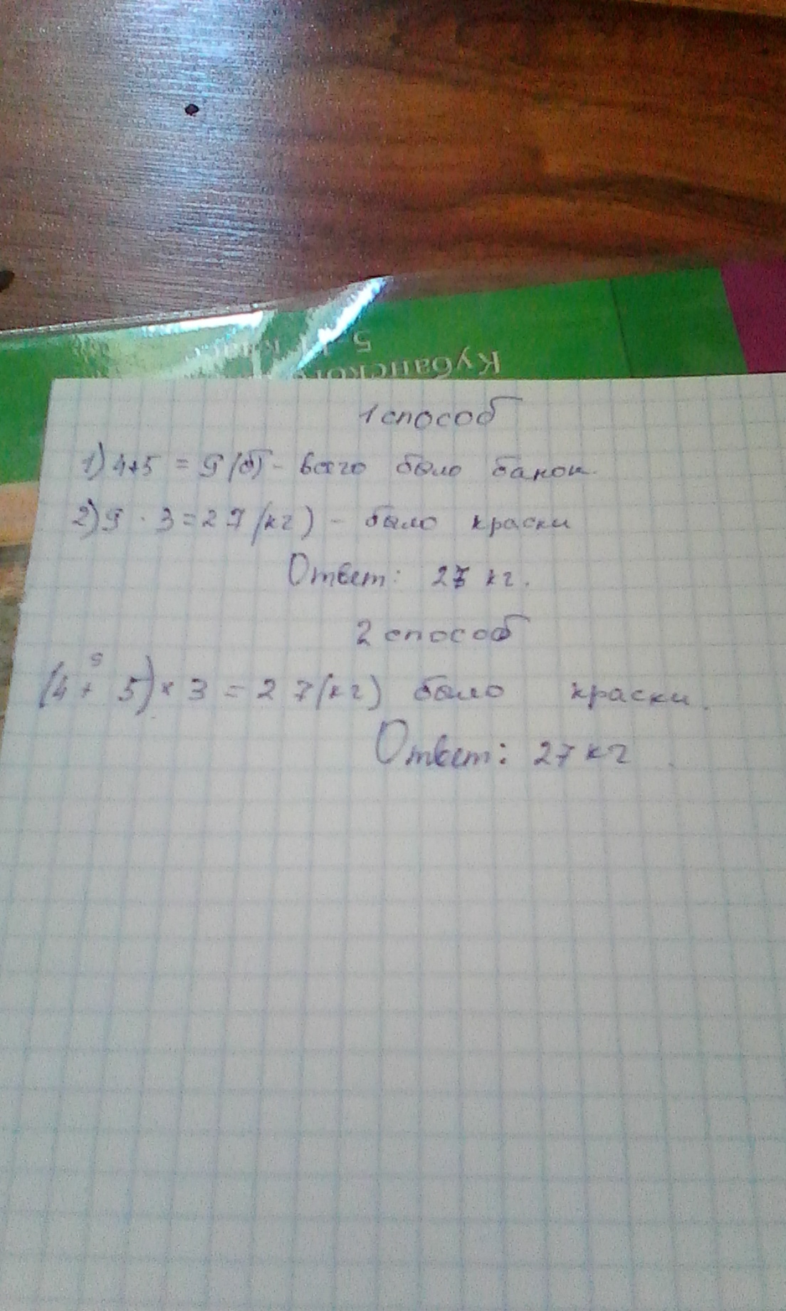В первый день на окраску дверей израсходовали 4банки краски,по3кг в каждой,во второй -5таких же банок.Сколько килограммов краски израсходовали за два дня.Реши задачу двумя способами