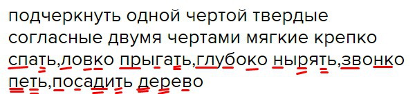подчеркнуть одной чертой твердые согласные двумя чертами мягкие крепко спать,ловко прыгать,глубоко нырять,звонко петь,посадить дерево