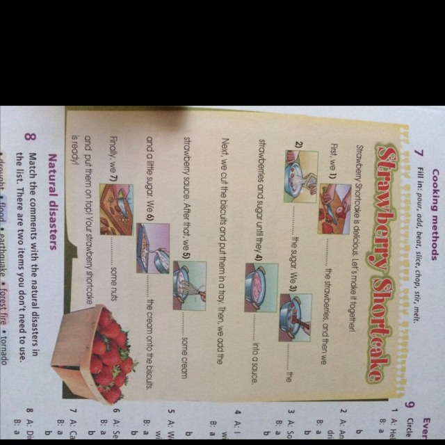1)slice 2)add 3)stir 4)melt 5)beat 6)pour 7)chop