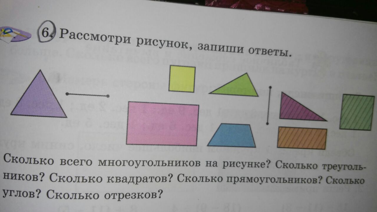 7 многоугольников,3 треугольника,2 квадрата,2 прямоугольника,24 угла,2 отрезка.