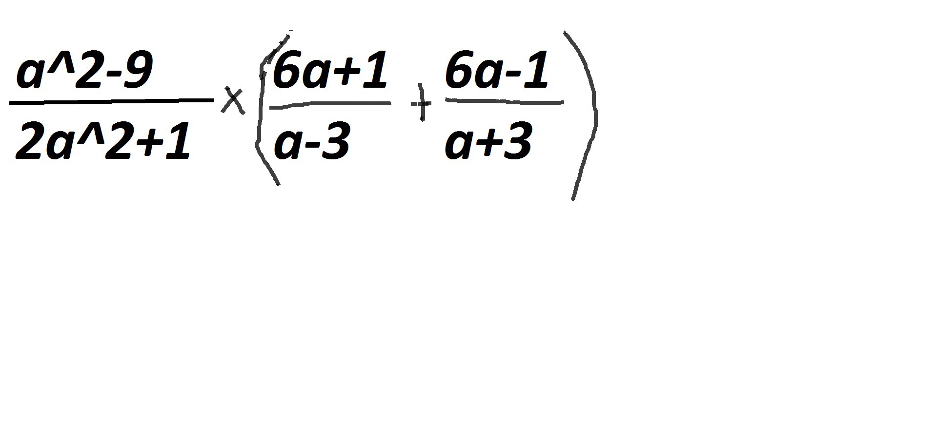 frac{a^2-9}{2a^2+1}bullet(frac{6a+1}{a-3}+frac{6a-1}{a+3})=frac{a^2-9}{2a^2+1}bullet(frac{(6a+1)(a+3)}{(a-3)(a+3)}+frac{(6a-1)(a-3)}{(a+3)(a-3)})=\\=frac{a^2-9}{2a^2+1}bulletfrac{(6a+1)(a+3)+(6a-1)(a-3)}{(a-3)(a+3)}=frac{a^2-9}{2a^2+1}bulletfrac{(6a+1)(a+3)+(6a-1)(a-3)}{a^2-9}=\\=frac{(6a+1)(a+3)+(6a-1)(a-3)}{2a^2+1}=frac{6a^2+18a+a+3+(6a^2-18a-a+3)}{2a^2+1}=\\=frac{12a^2+3+3}{2a^2+1}=frac{12a^2+6}{2a^2+1}=frac{6(2a^2+1)}{2a^2+1}=6.