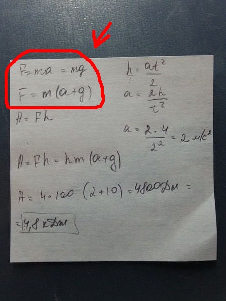 Сила,под которой груз совершает работу(НЕ СИЛА ТЯЖЕСТИ,А ТА,КОТОРАЯ ГРУЗ НА ВЕРХ ПОДНИМАЕТ) по второму закону ньютона равна: