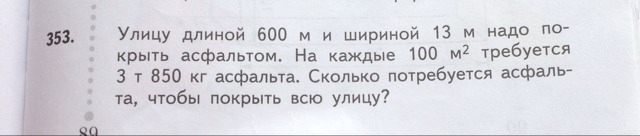 Улицу длинной 600 м и шириной 13 надо покрыть асфальтом. На каждые 100 м требуется 3 т 850 кг асфальта . Сколько потребуется асфальта, чтобы покрыть всю улицу?