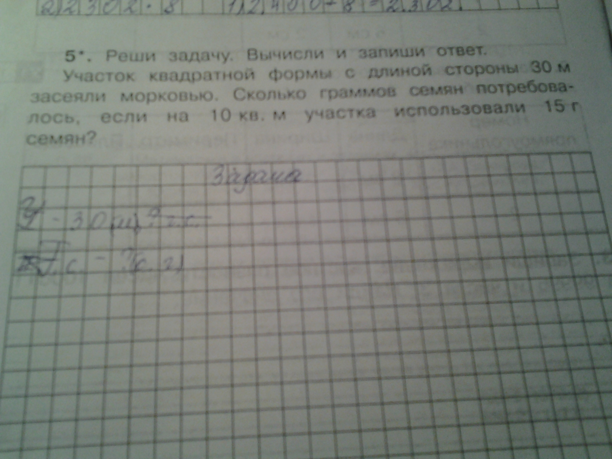 Реши задачу Вычисли и запиши ответ участок квадратной формы длиной стороны 30 метров засеяли морковью сколько граммов семян потребовалось если на 10 кв. м. участка использовали 15 г семян