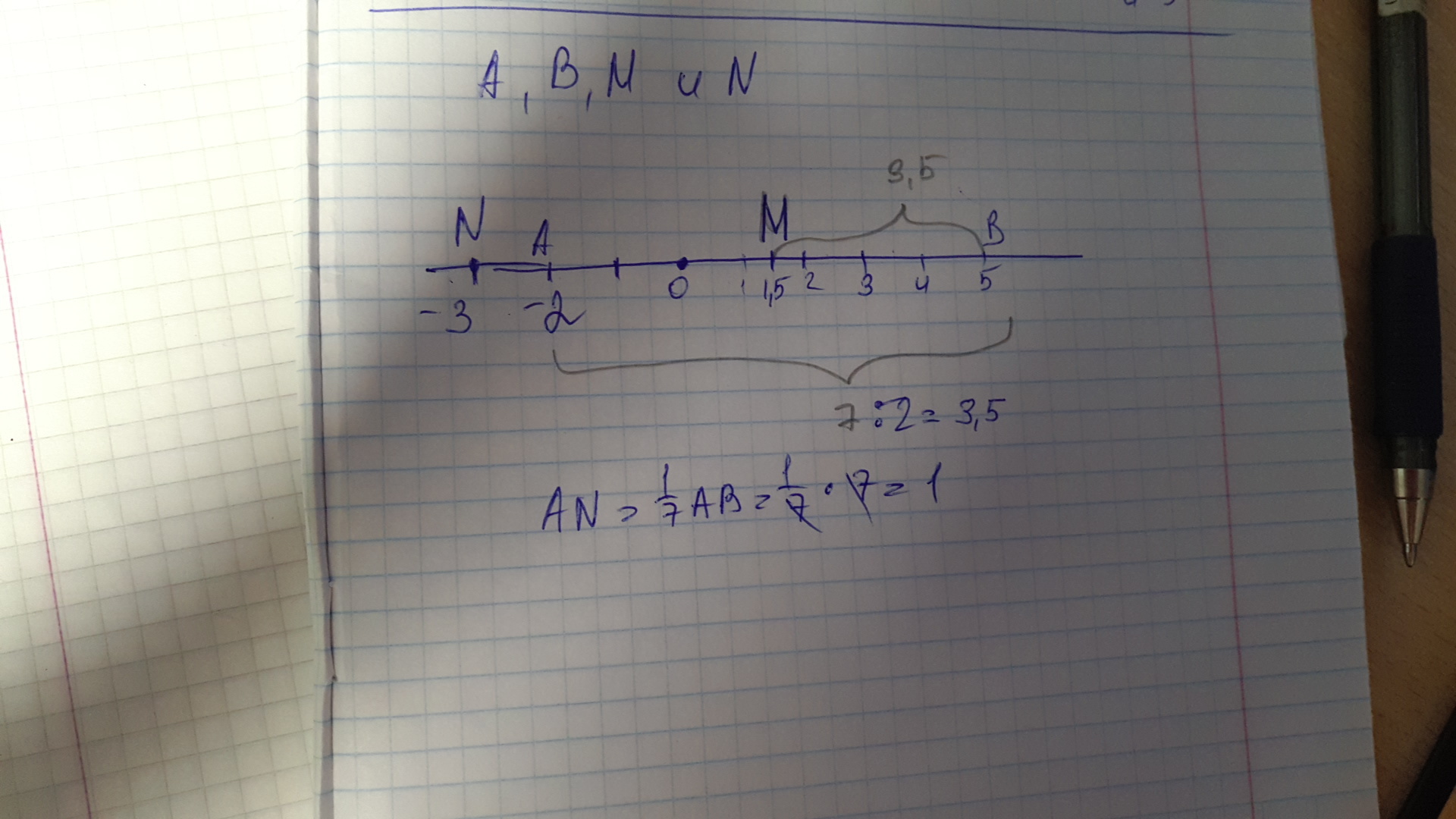 Отметьте на координатной прямой точки A, B, M и N и укажите их координаты, если известно, что 1) координата точи А левее 0 на 2 2) точка B расположена правее точки A, отрезок AB равен 7 3) точка M делит отрезок AB попалам 4) точка N лежит левее точки A, AN =17 AB