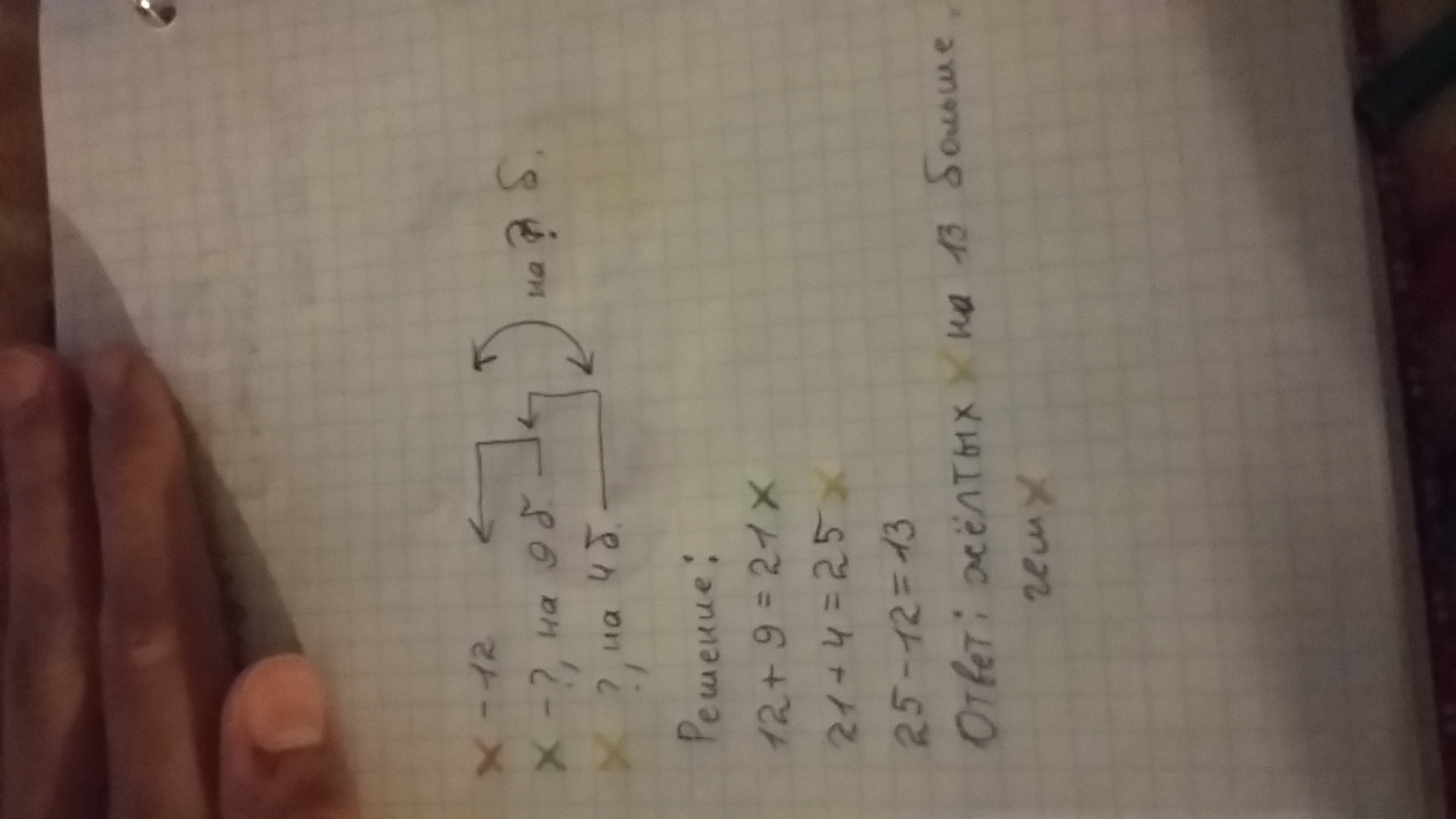 Реши задачу вычисли и запиши ответ вы зури 12 красных крестиков зелёных на девять больше чем красных жёлтых на четыре больше чем зелёных насколько больше жёлтых крестиков чем красных