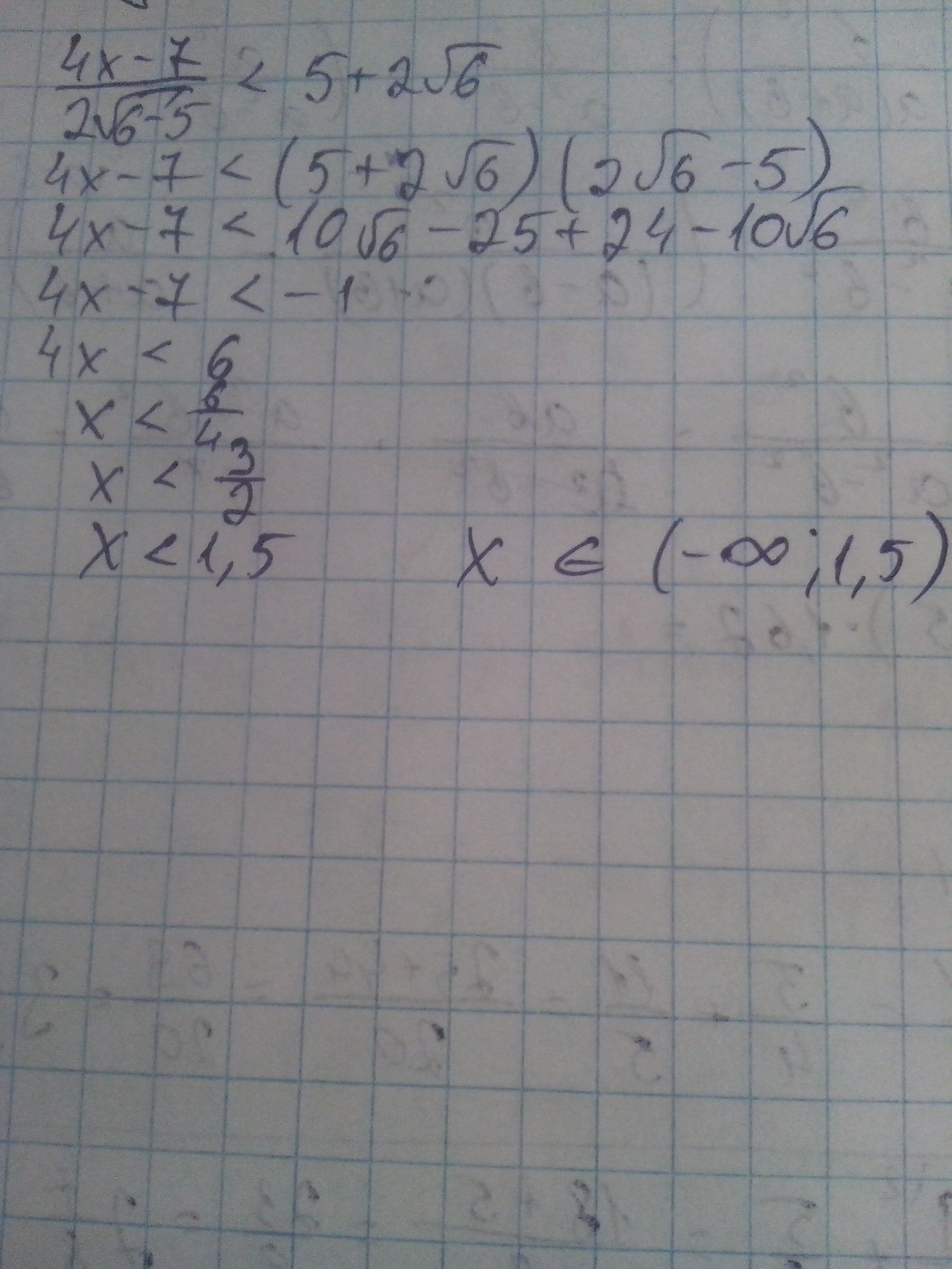 В числителе: 4х-7 ;в знамен.: 2 корней из 6 - 5. < 5+2 корней из 6.