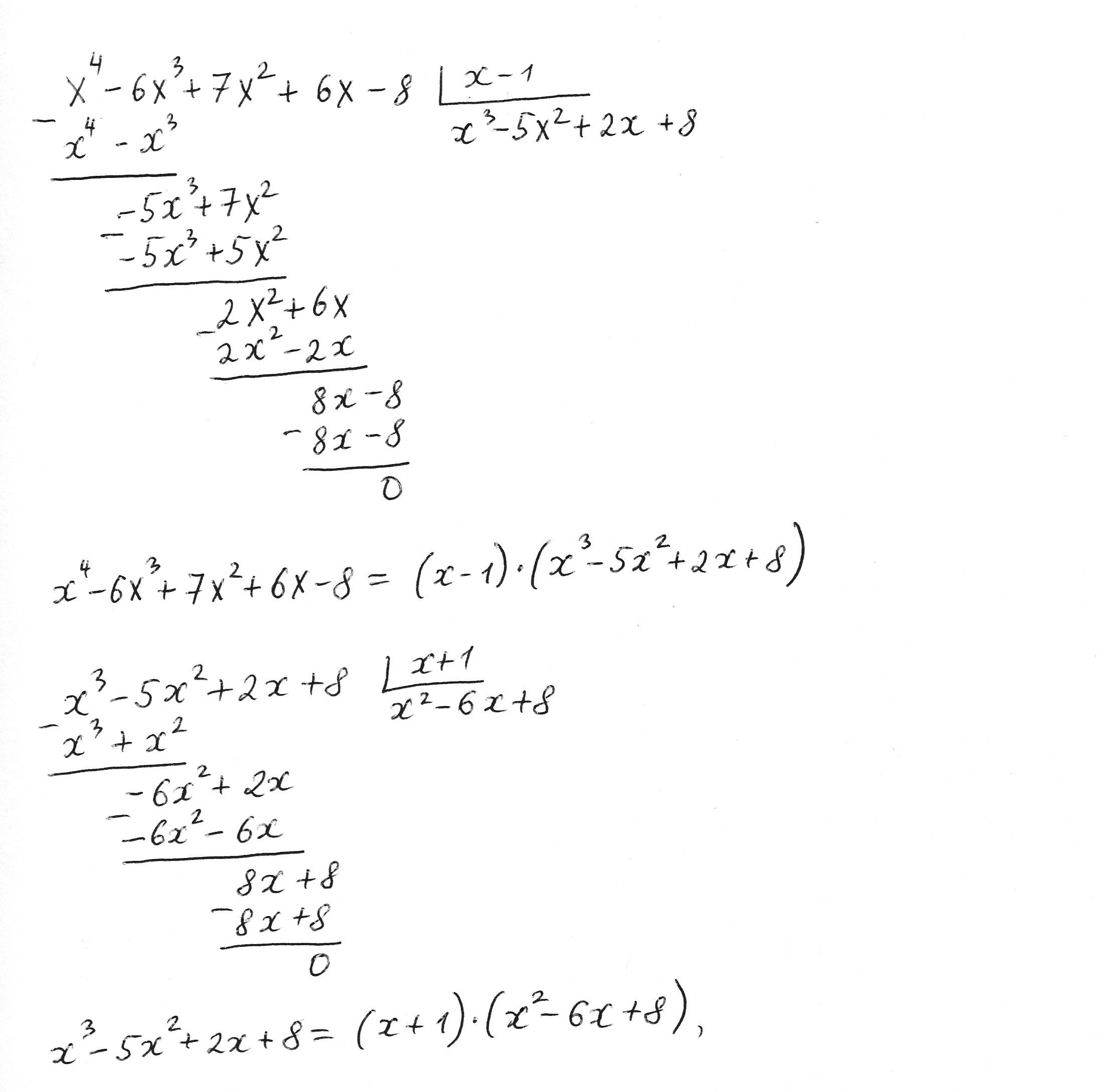 Далее опять делим (x^3 - 5x^2 +2x + 8) на (x+1) столбиком. (на листочке, прикрепленном ниже).