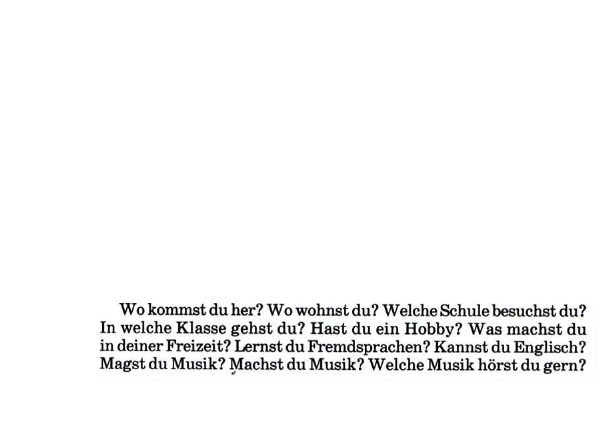 Откуда ты? Где ты живёшь? Какую школу посещаешь? В какой класс ты ходишь? У бы есть хобби? Что ты делаешь в свободное время? Учишь ли ты иностранный язык? Можешь ли ты говорить на английском? Ты любишь музыку? Умеешь ли ты сам создавать музыку? Какую музыку ты слушаешь с большим удовольствием?