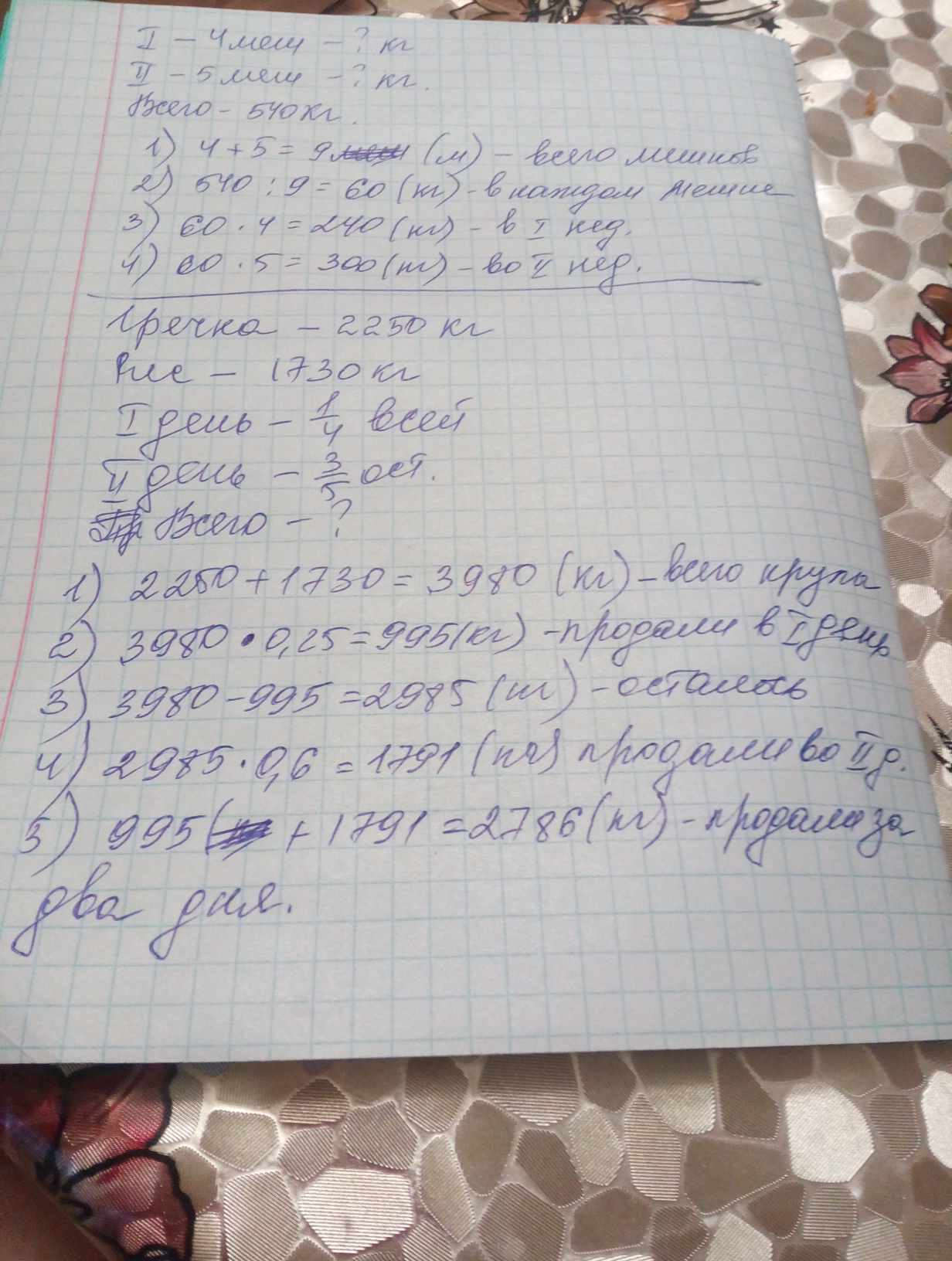 В магазин привезли 2250 кг гречки и 1730 кг рису.В первый день продали 1/4 часть всей крупы,а во второй день 3/5 части оставшегося.Сколько крупы продали за два дня?