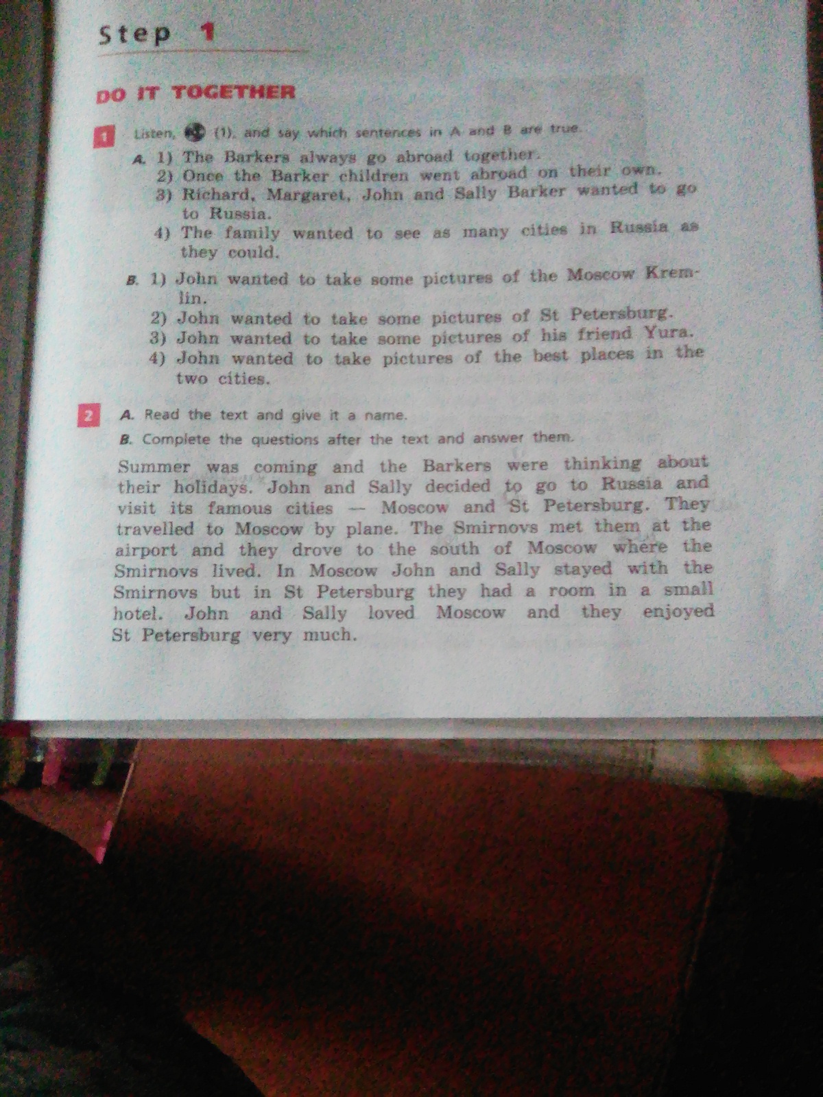 Саммер уос каминг энд зэ Баркерс уэ финкинг эбаут зэйр холидэйс. Джон энд Салли дисайдид ту гоу ту Раша энд визит итс фэймоус ситис - Москоу энд Сэйнт Питерсбург. Зэй трэвэллэд ту Москоу бай плэйн. Зэ Смирновс мэт зэм эт зэ эйрпорт энд зэй дроув ту зэ сауф оф Москоу уэ зэ Смирновс ливд. Ин Москоу Джон энд Салли стэйд уиф зэ Смирновс бат ин Сэйнт Питерсбург зэй хэд э рум ин а смолл хотел. Джон энд Салли лавд Москоу энд зэй инджойд Сэйнт Питерсбург вери мач
