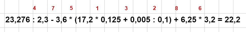 23,276 : 2,3 - 3,6 * (17,2 * 0,125 + 0,005 : 0,1) + 6,25 * 3,2 = 22,2