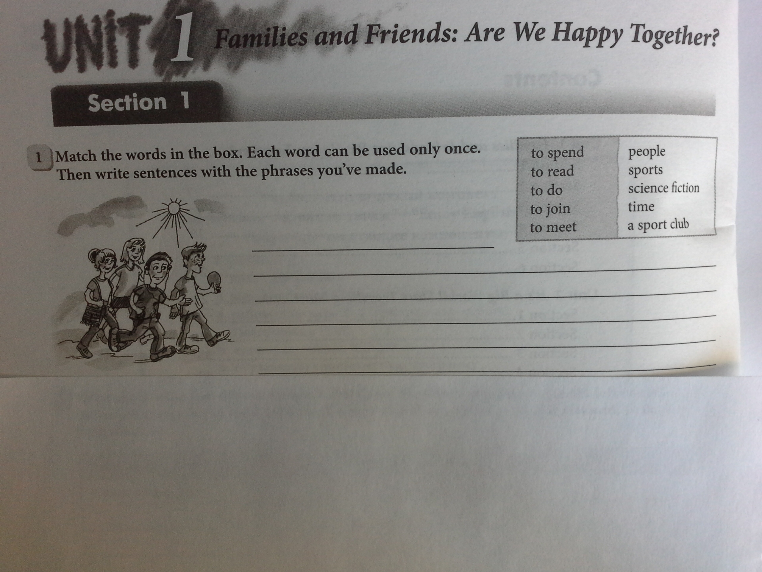 Соедините слова в рамке .Каждое слово может быть использовано один раз.Затем напишите предложения с полученными фразами.