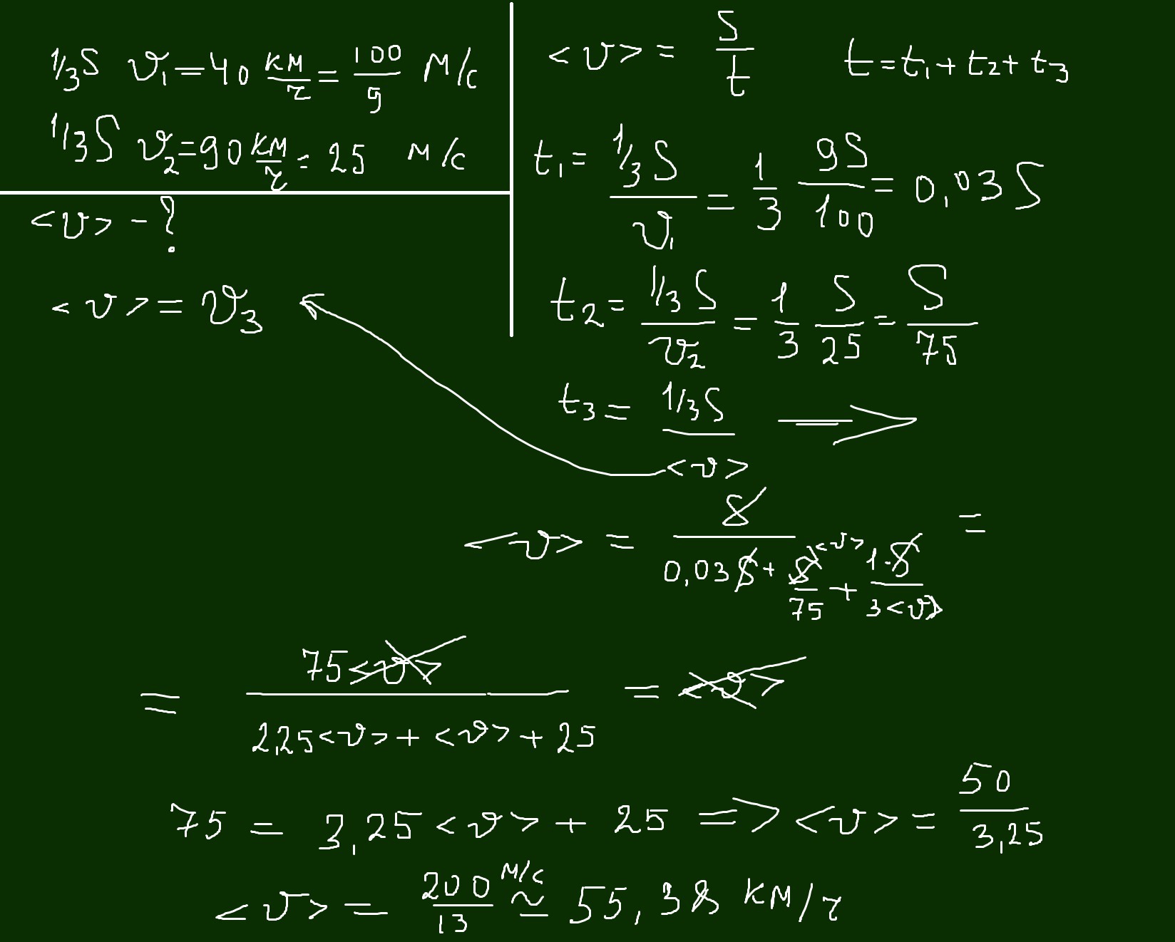 Треть всего пути автомобиль проехал с постоянной скоростью VI =40 км/ч. Затем треть всего времени он ехал с постоянной скоростью V2 = 90 км/ч. Найдите среднюю скорость на всём пути, если она оказалась равна средней скорости на оставшемся