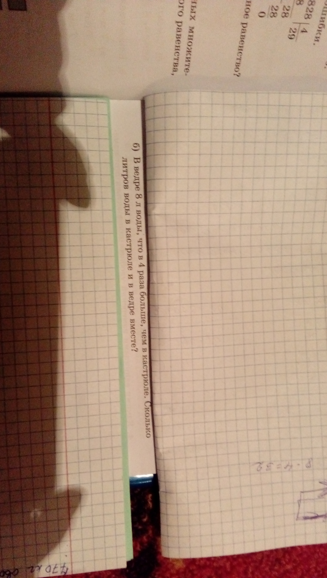 воды в ведре в 4 раза больше, значит в кастрюле в 4 раза меньше 8/4=2!!!!!!!!!!!!!!!!!!!!!!!!