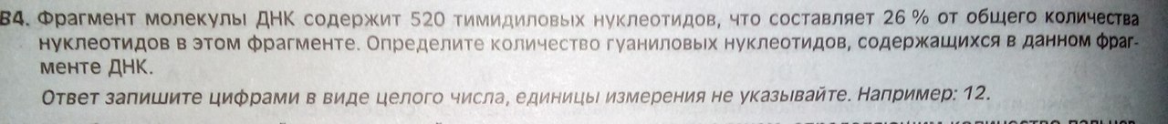 в ДНК количество тимина равно количеству аденина. То есть в этом фрагменте 520 аденина и 520 тимина. По процентам 26%тимина 26% аденина. Складываем и получаем 52%. Кол-во гуанина равно цитозину, по процентам это всего 100-52=48%. А тогда гуанина 48:2=24%. Теперь пропорция.