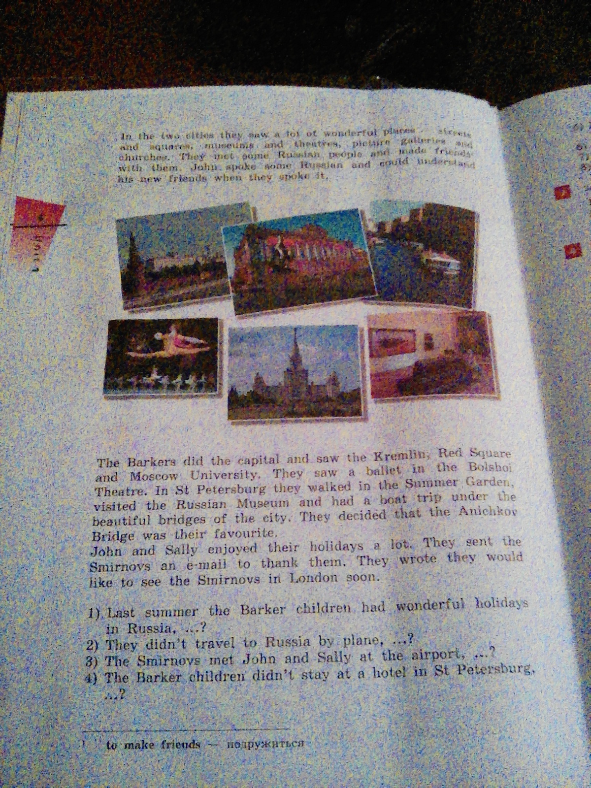 Зэ Баркэс дид зэ капитал энд со зэ Кремлин, Рэд Скуэре, энд Москоу Юниверсити.( Баркерсы посетили столицу и увилели Кремль, Красную площадь и Московский Университет.) Зэй со э бэллит ин зэ Большой Thета.(Они видели баллет в Большом Театре). Ин Сэнт Питесбёг зэй воукэд ин зэ Саммэ Гардэн энд визитед зэ Рашн Мъюзим энд хэд э боат трип андэ бьютифул бриджес оф зэ сити.(В Санкт-Питербурге они пошли в Летний сад, видели Русский музей и прокатиоись на катерах под прекрасными мостами города). Зэй дисайдэд зэт зэ Аничков Бридж уоз зэйр фэйворит.(Они решили, что Аничков мост оказался их самым любимым,)