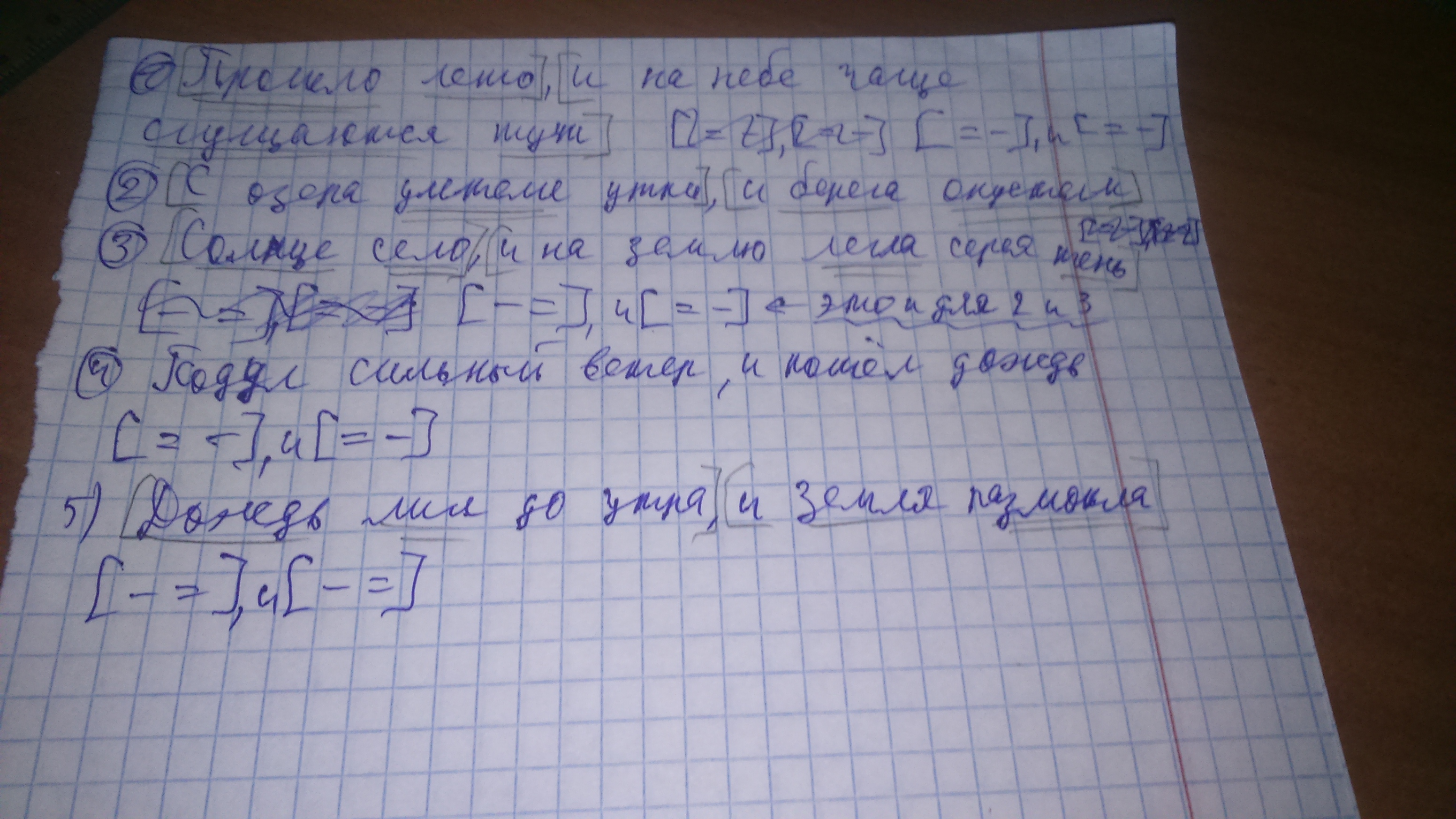 1. Прошло лето, и на небе чаще сгущаются тучи. 2. С озера улетели утки, и берега опустели. 3. Солнце село, и на землю легла серая тень. 4. Подул сильный ветер, и пошёл дождь. 5. Дождь лил до утра, и земля размокла.