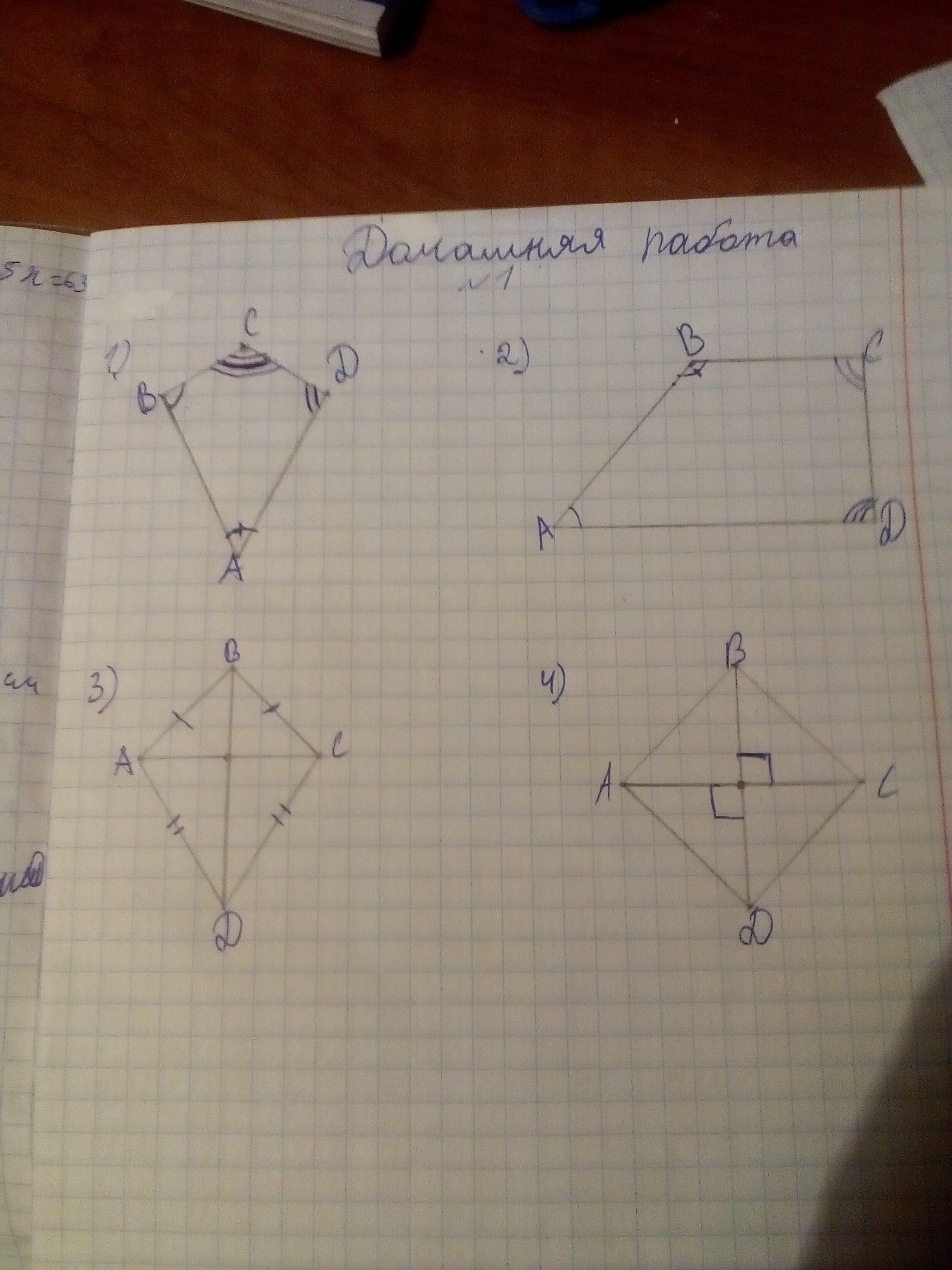 Начертите четырехугольник , в котором 1) три угла тупых; 2) два соседних угла- прямые , а два других не являются прямыми; 3)одна диагональ точкой пересечения диагоналей делится пополам, а другая не делится пополам; 4 )диагонали перпендикулярны
