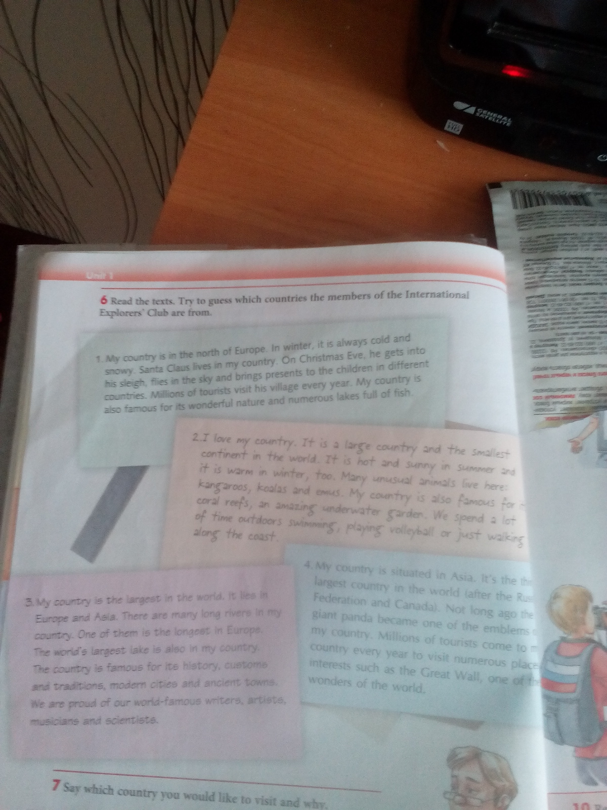 1) Моя страна в северной Европе. Зимой всегда холодно и снежно. Санта Клаус живет в моей стране. На Рождество он на санях летает в небе и приносит родителей детям разных стран. Миллионы туристов посещают деревню каждый год. моя страна очень популярна также своими рыбами