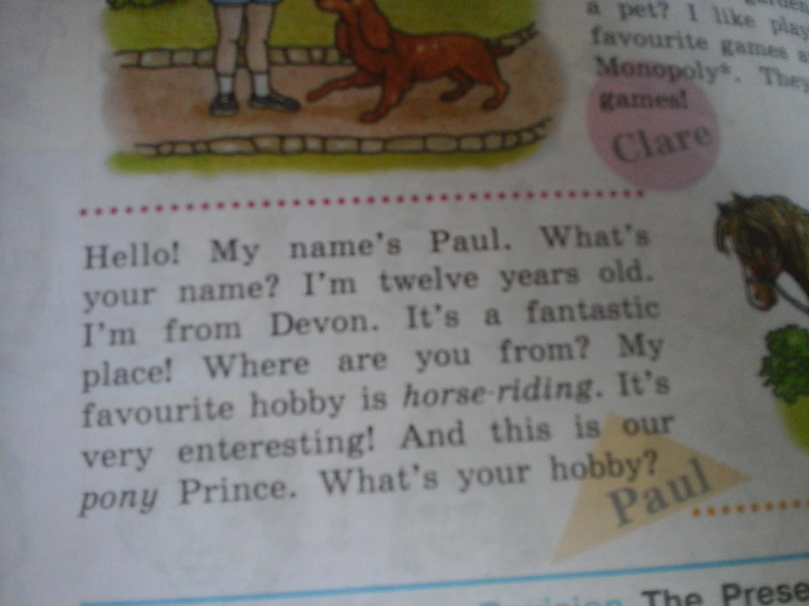 Привет! Меня зовут Павел. Как зовут тебя? Мне двенадцать лет. Я из Девона. Это великолепное место! Откуда ты? Я увлекаюсь верховой ездой. Это очень интересно.Мой пони Принц. Какое твое хобби?