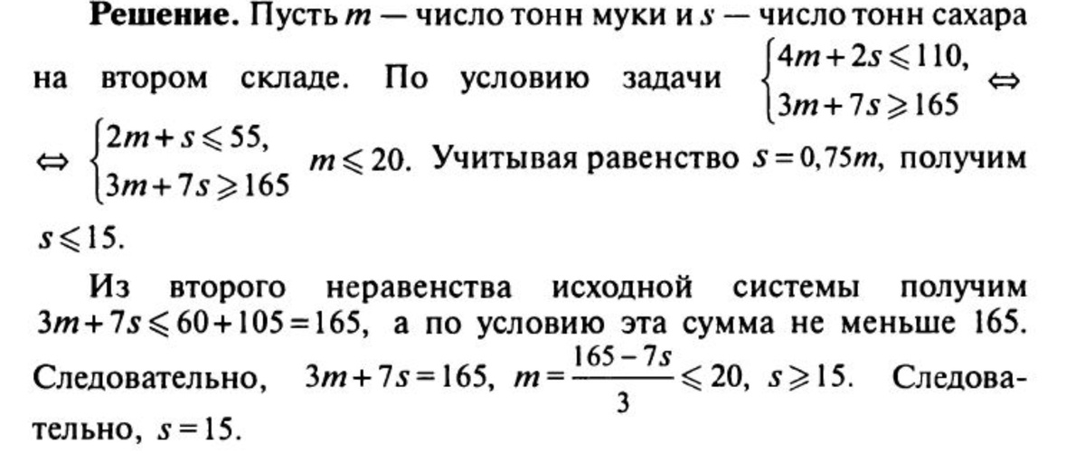 На первом складе находится мука и сахар, причём муки в 4 раза больше, а сахара в 2 раза больше, чем на втором складе, и их общий вес не превышает 110 т. На третьем складе муки в 3 раза больше, а сахара в 7 раз больше, чем на втором складе, и их общий вес не меньше 165 т. Сколько тонн сахара было на втором складе, если вес сахара на этом складе составлял 0,75 веса муки?
