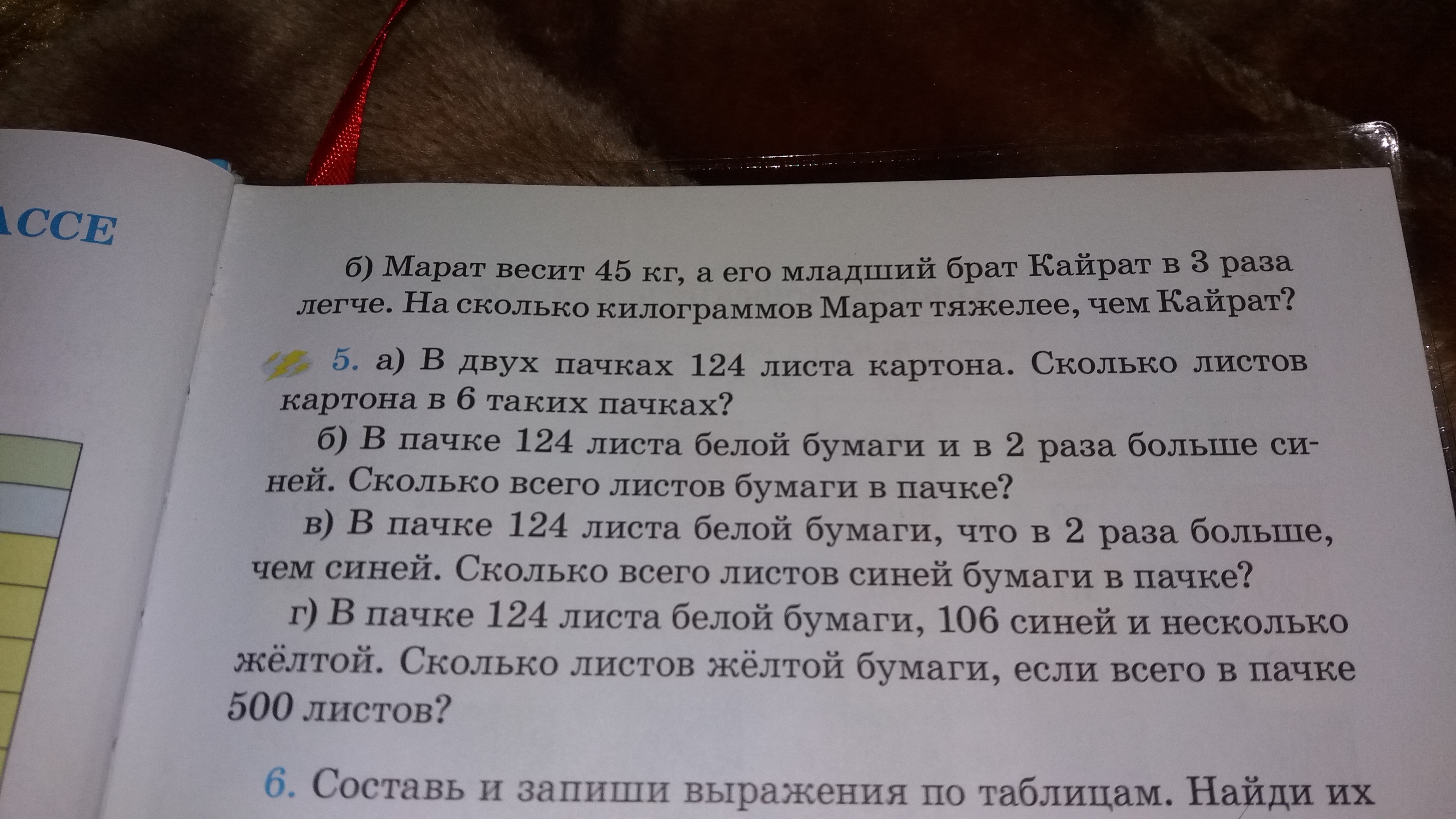 1 задача- решение: 1)124:2-62 2)62*6=372 ответ:в 6 таких пачках 372 листов картона 2 задача- решение: 1)124*2=248 2) 124+248=372 ответ:в 1 пачке 372 листов бумаги 3 задача- решение:1) 124:2=62 ответ:всего 32 листов бумаге в 1 пачке 4 задача- решение: 1)500-124=376 2)376-106= 270 ответ:в пачке 270 листов желтой бумаги